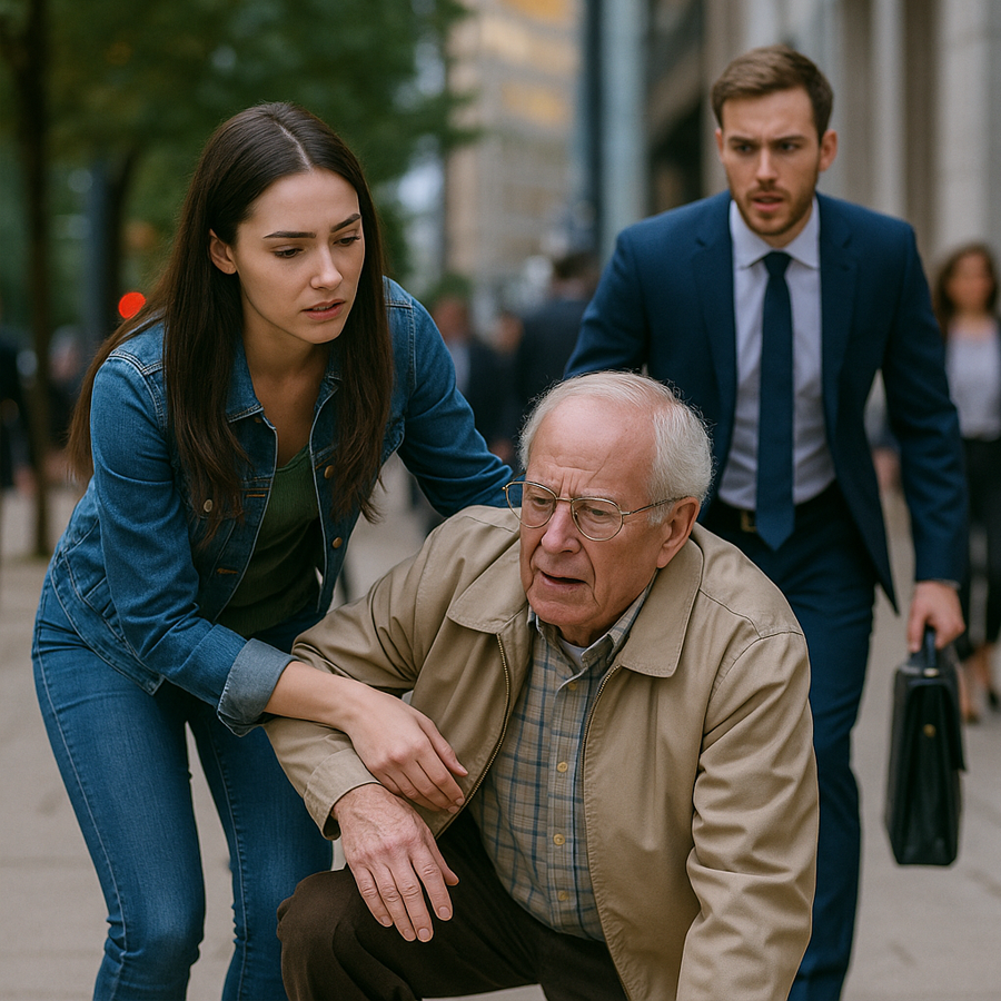 En la esquina de la calle Monroe, un anciano de cabello blanco caminaba lentamente con un bastón. Nadie se fijaba en él. Los transeúntes pasaban a su lado sin mirarlo, absortos en sus teléfonos. De repente, el hombre tropezó y cayó al suelo, golpeando su cabeza contra el pavimento.