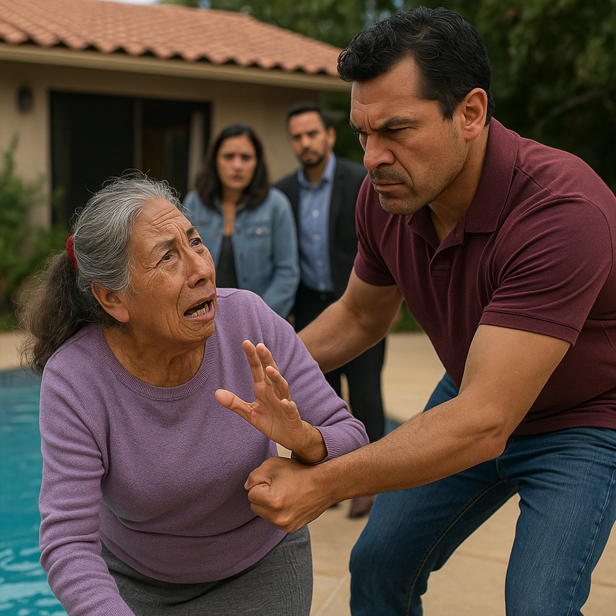 El gesto fue tan rápido que nadie tuvo tiempo de reaccionar. El cuerpo frágil de la anciana cayó al borde de la piscina, resbaló y cayó al agua. Un grito desgarrador se escuchó: