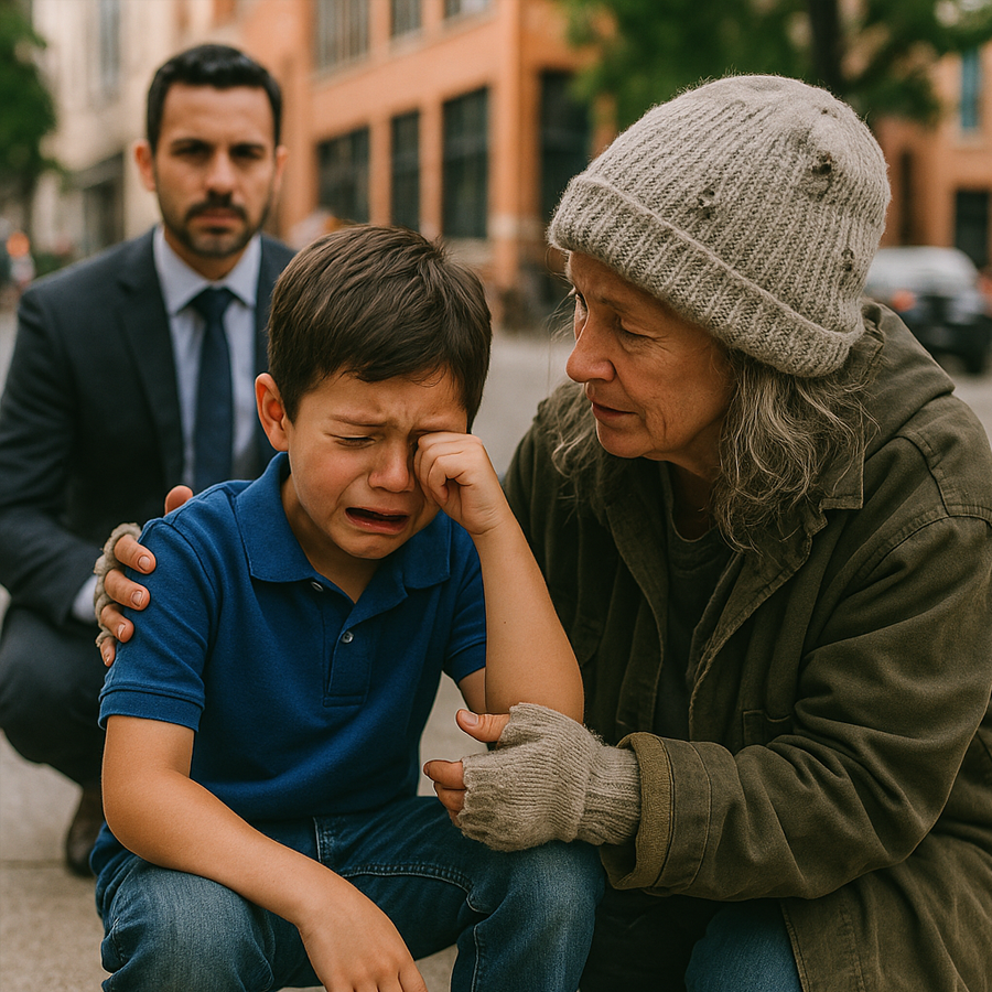“Una mujer sin hogar vio a un niño llorando en plena calle y no dudó en acercarse para ayudarlo. Lo que ella no sabía era que, a pocos metros, un hombre elegante la observaba en silencio… y ese hombre era el padre millonario del pequeño. Lo que ocurrió después dejó a todos sin palabras: una historia que demuestra que la verdadera riqueza no siempre se mide en dinero, sino en compasión.”