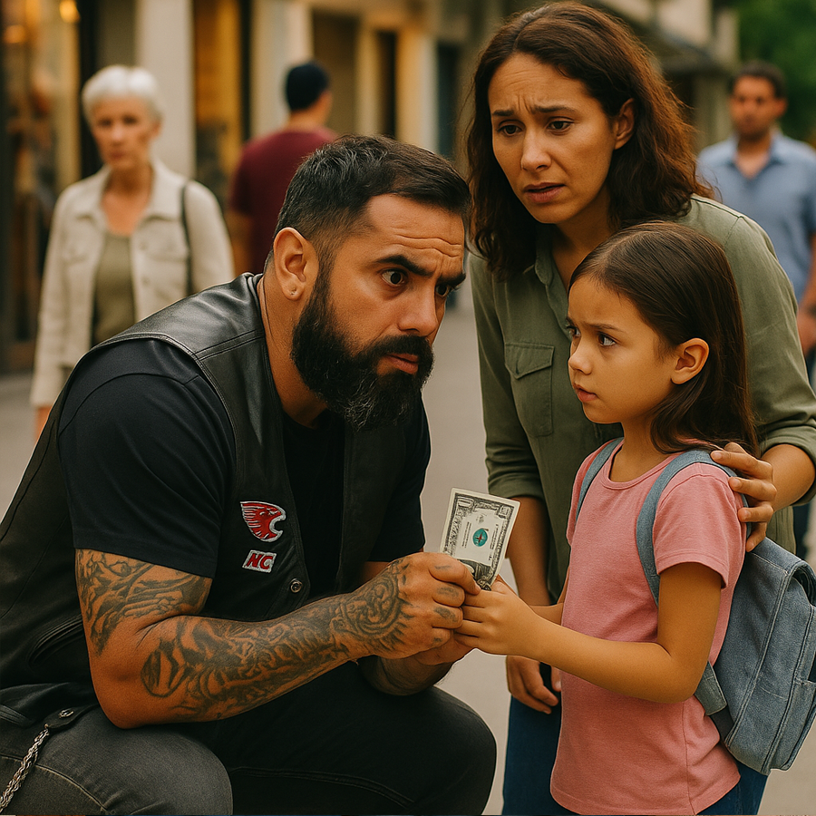 “Una niña detuvo a un imponente motociclista y le entregó 5 dólares: lo que le pidió después dejó al hombre completamente conmocionado. En un mundo donde la dureza y la desconfianza parecen dominar, esta inesperada interacción entre una pequeña de corazón puro y un miembro de una temida banda de motociclistas se convirtió en una historia que conmovió al mundo. Lo que comenzó como un simple acto de valentía infantil terminó transformando por completo la vida de un hombre marcado por el pasado.”