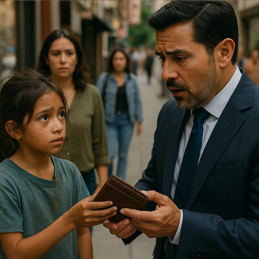 “Una niña pobre devolvió la billetera perdida de un multimillonario sin saber a quién pertenecía — pero cuando él la abrió, encontró algo que lo hizo llorar frente a todos. Lo que había dentro no era dinero ni documentos, sino una revelación que cambiaría la vida de ambos para siempre. Nadie imaginaba el vínculo oculto que los unía, ni la increíble historia detrás de aquel pequeño acto de honestidad.”