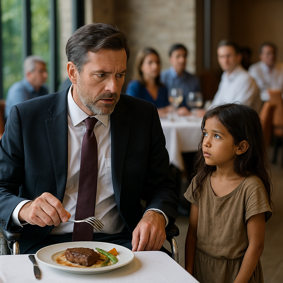 Mientras el empresario terminaba su plato, los meseros se apresuraban a limpiar la mesa. Afuera, la lluvia golpeaba las ventanas, y en la puerta del restaurante una pequeña figura esperaba bajo un paraguas roto.