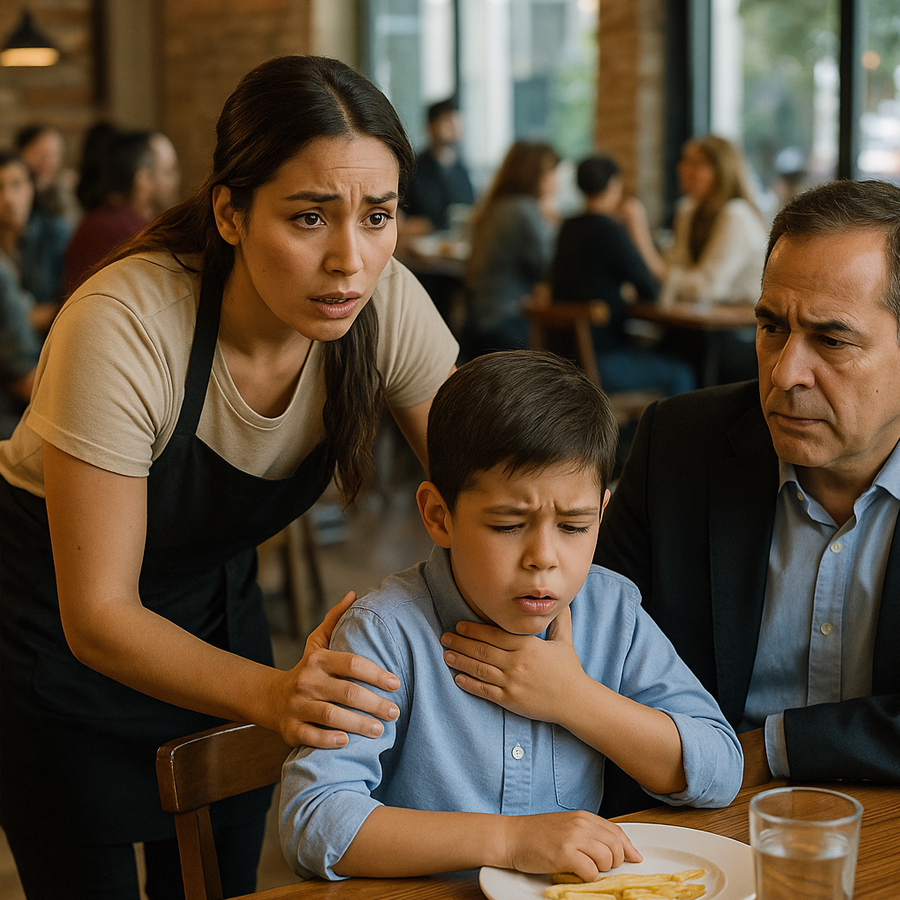 El niño, que hacía apenas un momento reía, ahora tenía el rostro pálido. Se llevaba las manos al cuello, intentando respirar. Su padre, absorto en una llamada, no lo vio al principio. Fue Lucía quien soltó la bandeja sin dudar.