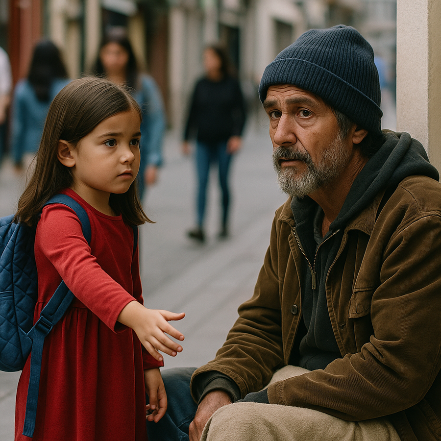 Una niña de unos ocho años, de cabello oscuro y ojos curiosos, se detuvo frente a él. Llevaba uniforme escolar, una mochila cara y un aire de inocencia que contrastaba con la dureza del entorno. Lo miró fijamente, sin miedo, y sus palabras fueron como un rayo: