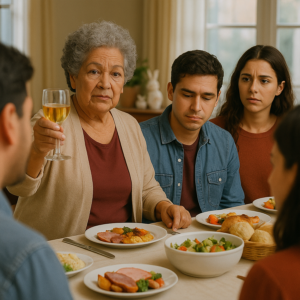 El momento llegó cuando todos ya tenían las copas llenas. El vino brillaba bajo la luz cálida del comedor. Mi madre se puso de pie, alzó su copa y se aclaró la garganta.
