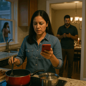 Las palabras rebotaron en mi cabeza mientras el mole burbujeaba, cada vez más oscuro. Una cosa era pensar que algo andaba raro, que Andrés estaba “distinto” desde hace tiempo, más distraído, más pegado al celular, más obsesionado con “juntas imprevistas”. Otra muy diferente era ver un mensaje así, concreto, con besito incluido.